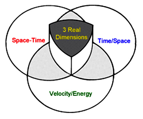 Dewey Larson’s Reciprocal System of the three real dimensions, where t = time, s = space, and v = velocity* shows that time-space is represented by t³/s³ and space-time is represented by s³/t³. Velocity (or what David points out is actually energy) is represented as thus: t³/s³ x s/t = t²/s². The product of mass and the second power of speed is t³/s³ x s²/t² = t/s, which is energy. The conjunction where these dimensions overlap is the midway point where all parts become one.