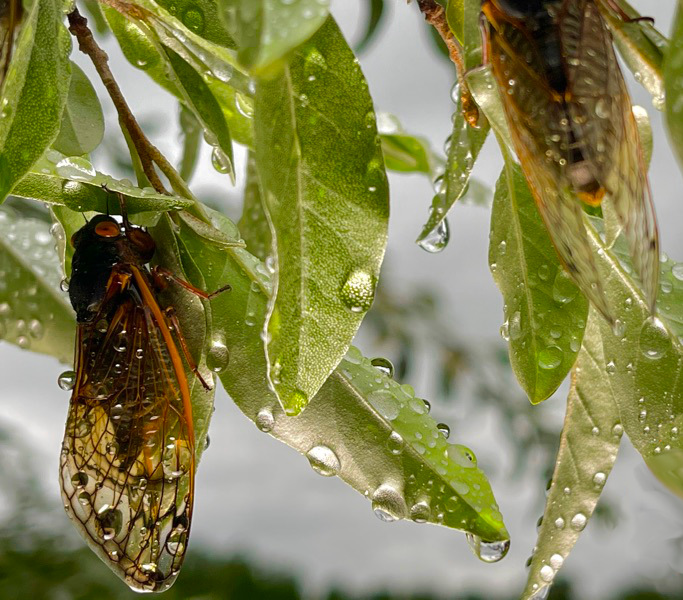 Okay, the image of cicadas perching on wet branches is not cutting it for me because wet bugs is what I think of when I read about dripping cicadas in the rain.