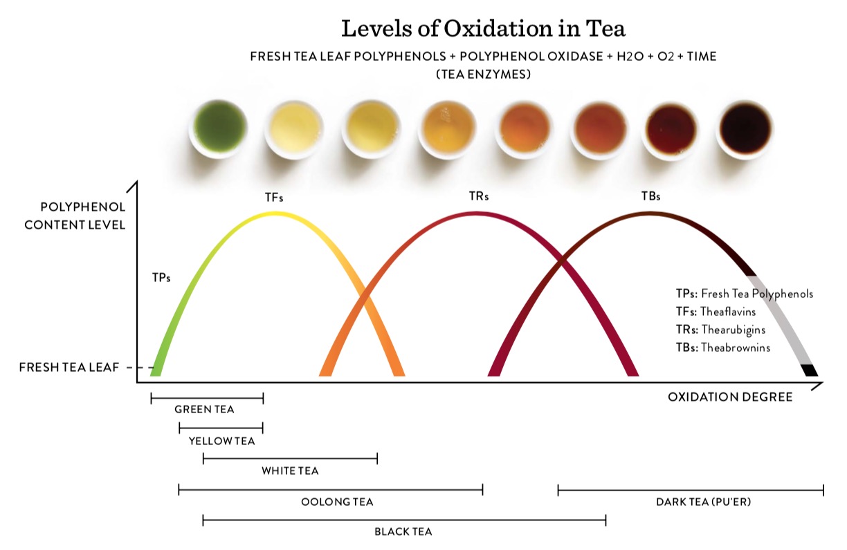 Fig. 1. The six categories of tea: green, yellow, white, oolong, black, and dark (Pu’er), depending on their levels of oxidation. (3)