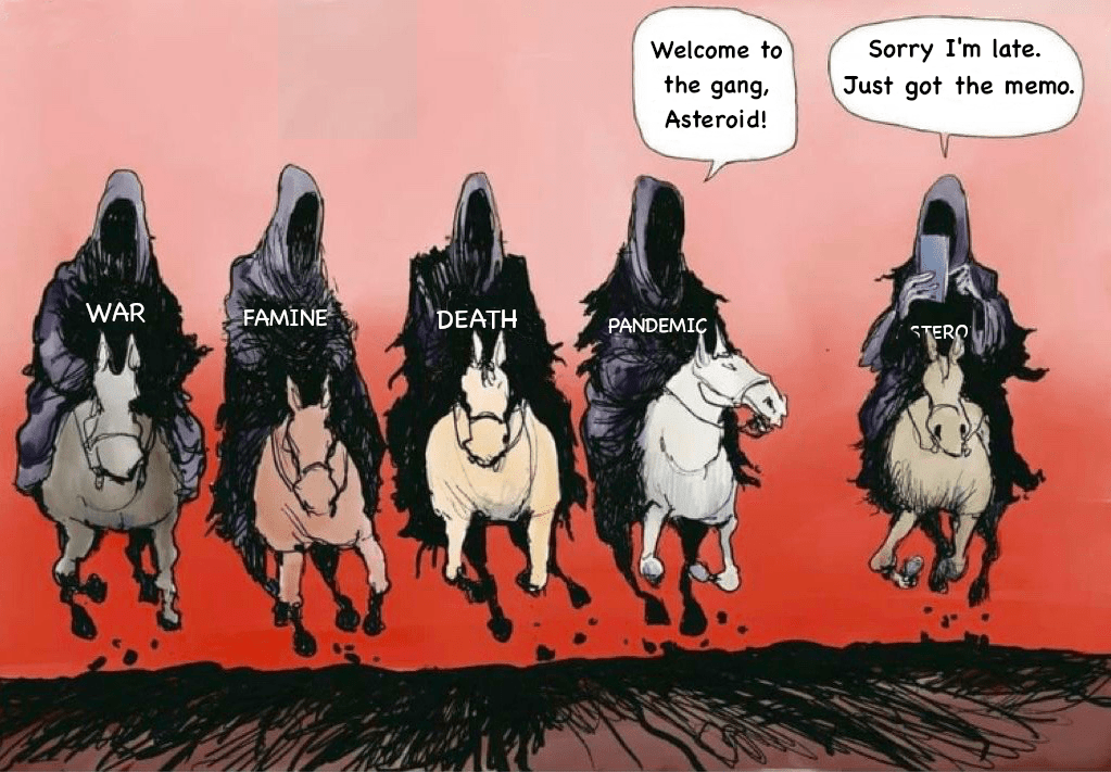 - ASTEROID – Yes, yes. I know this one is an odd duck, but if there is any horse that can possibly wipe us humans off the face of the planet, it would be one big ASTEROID impact. It would actually make a couple of the other horsemen look positively benign! Since we are now traveling through that part of the Milky Way Galaxy that is super crowded and densely littered with all sorts of