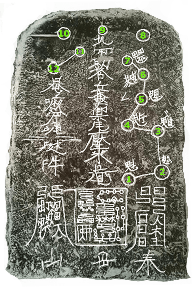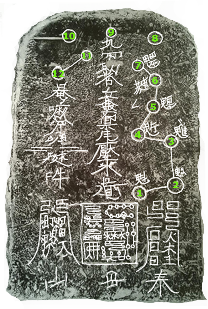 There is also the matter of that square in the center of the rock face. It seems to have the characters at the center like the one shown in the Japanese drawing, but the little circles joined by the dashes look more like the Taoist drawings.