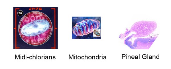 As you can see, he took great pains to make it obvious that these Midi-chlorians are similar to our own mitochondria. Even their names were suspiciously similar. Mito-chondria = Midi-chlorian. These Midi-chlorians are suppose to detect the energy field of the Force, and the higher the count of Midi-chlorians in your body, the more powerful you are as a Jedi.