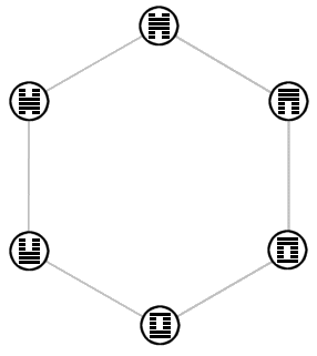 The outermost shell is the one with the three solid yang lines rising up through the yin lines. Dr. Schoter calls it Lifting a Block. It is very descriptive, because it does look rather like a heavy block that is being lifted. It looks like this.